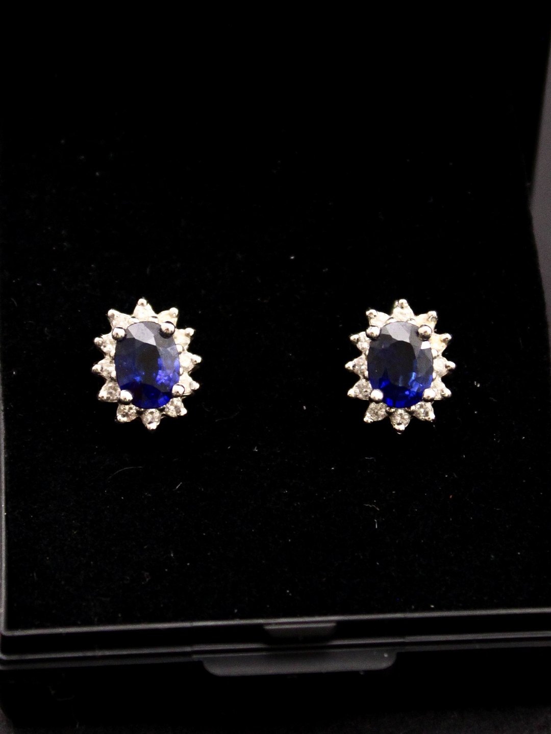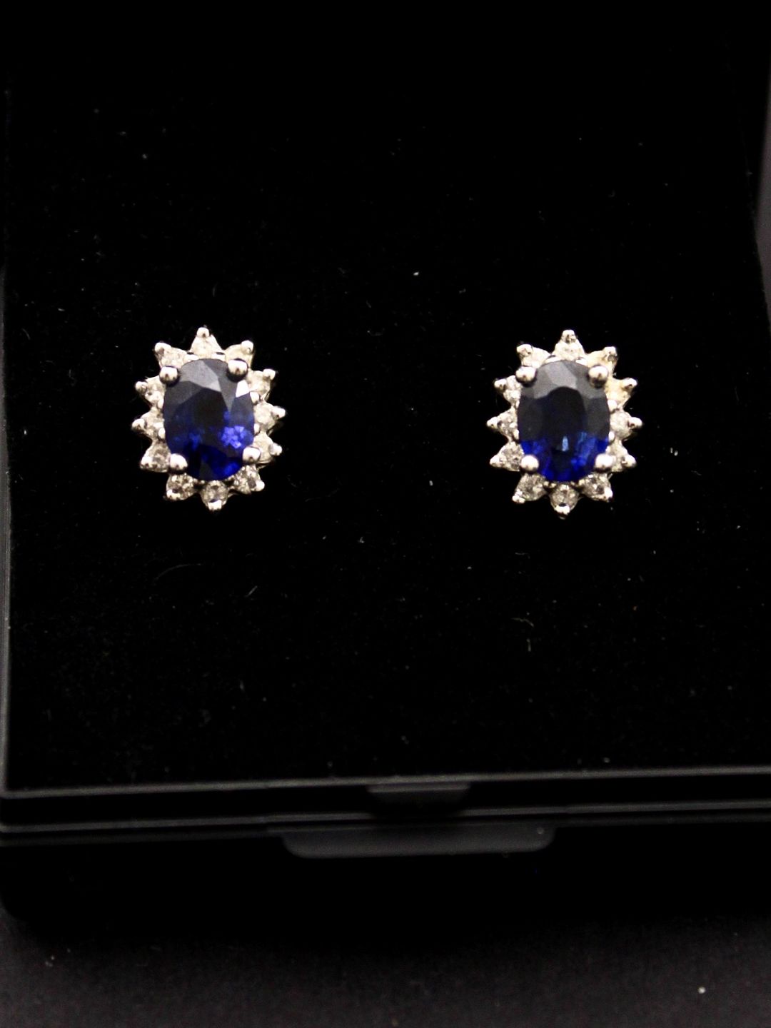 18 carat white gold ear studs measure 1.1 x 0.8 cm. sapphires surrounded by numerous diamonds item