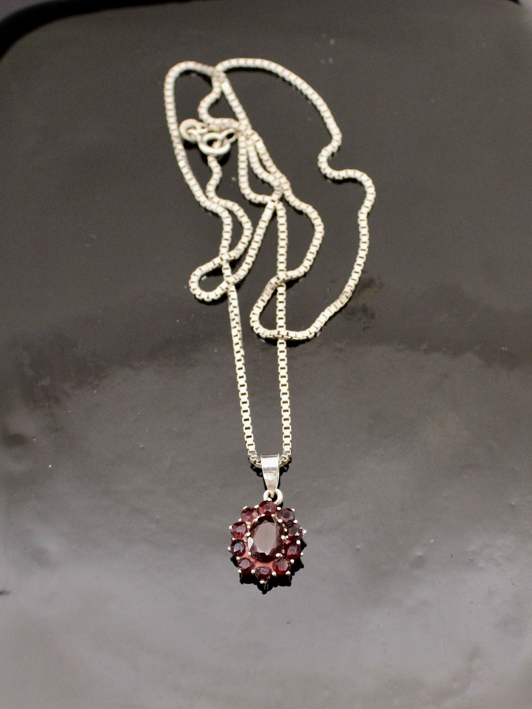 Sterling silver pendant 1.7 x 1.3 cm. with garnets and chain 49 cm. subject no. 540763