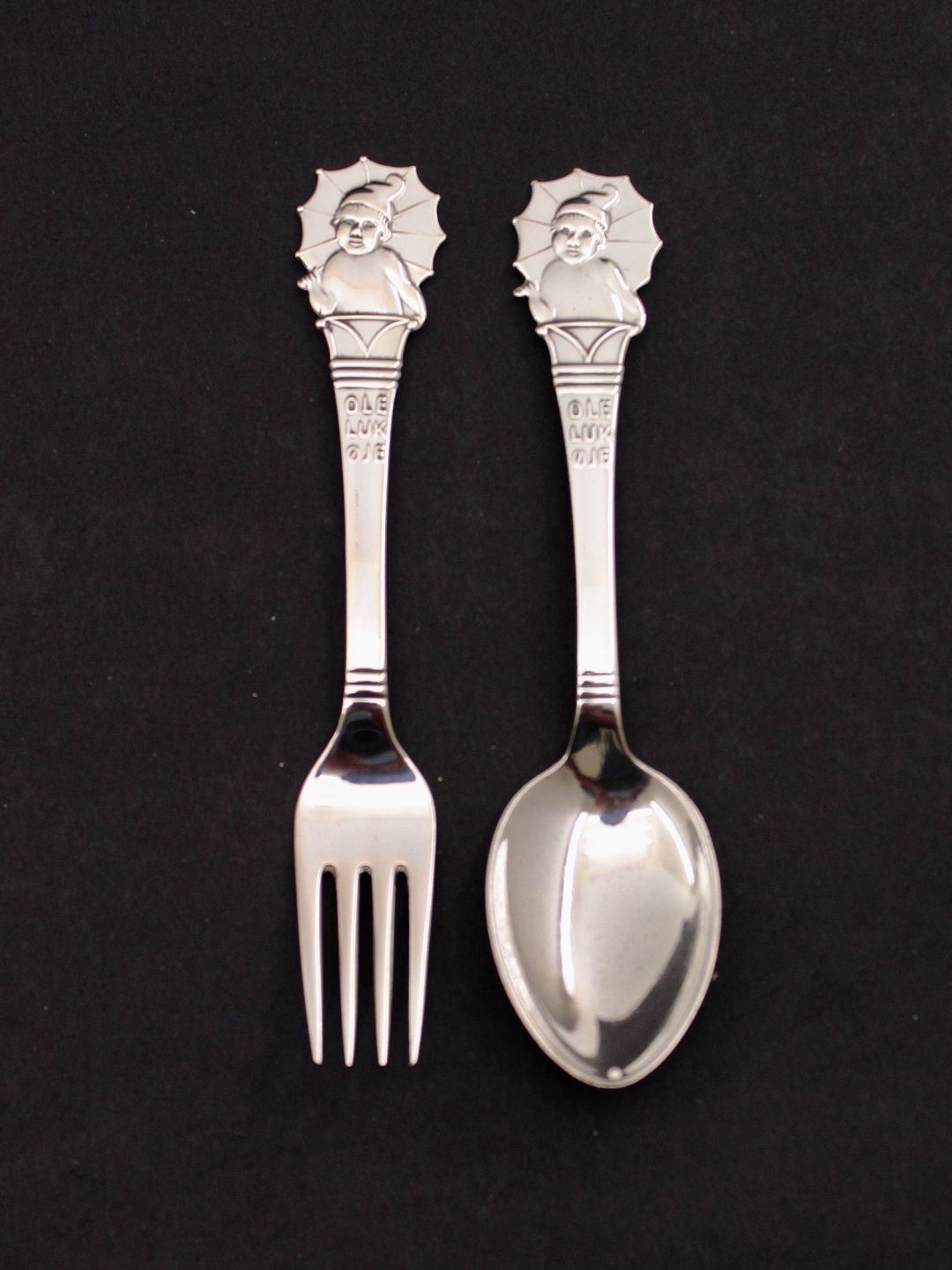 Barne bestik 14,5 cm "Ole Lukøje" tretårnet sølv flot ingen graveringer emne nr. 543188