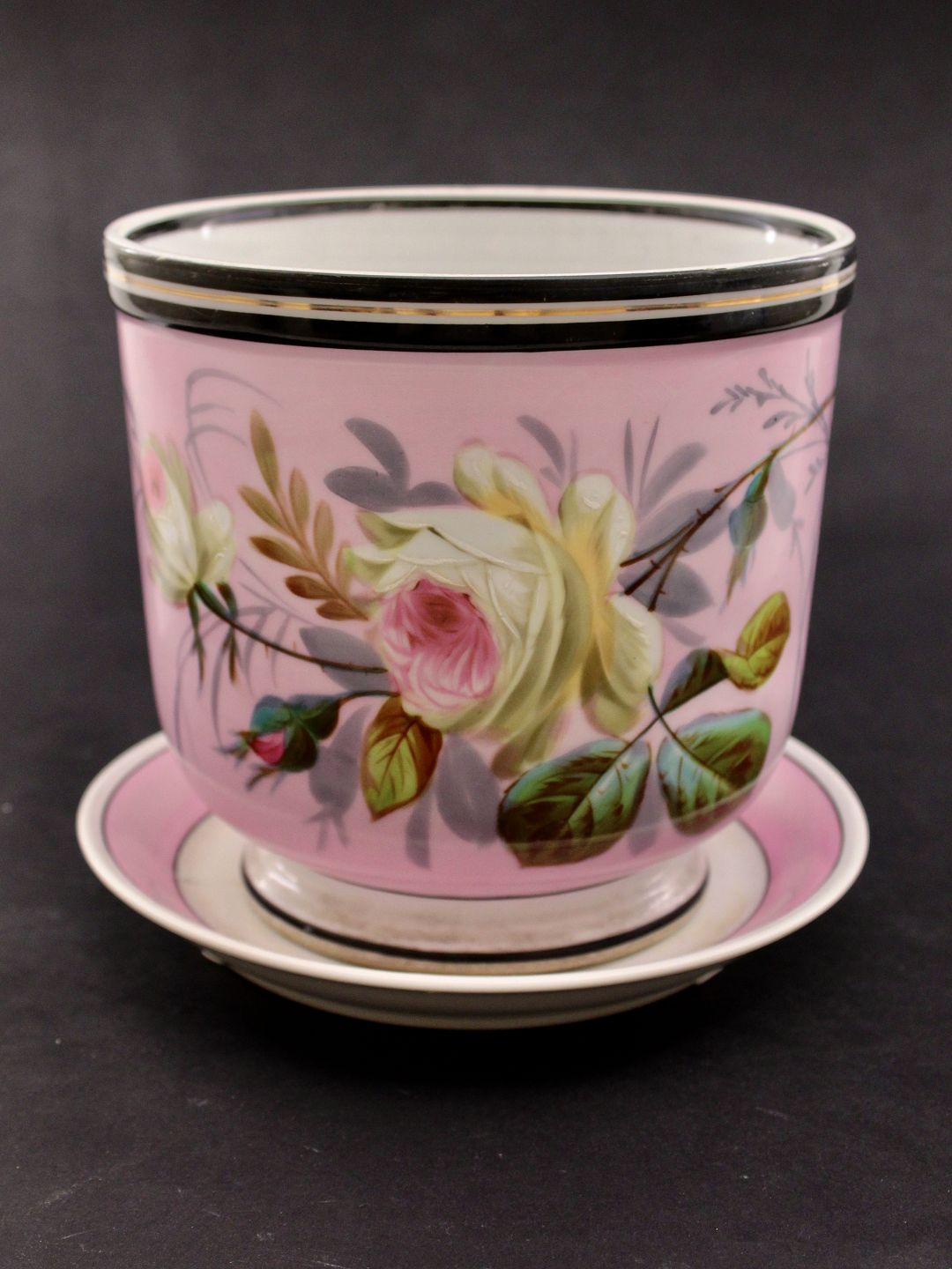 Lyserød urtepotte skjuler med underfad H. 18 cm. D. 18 cm. 19.årh. emne nr. 555484