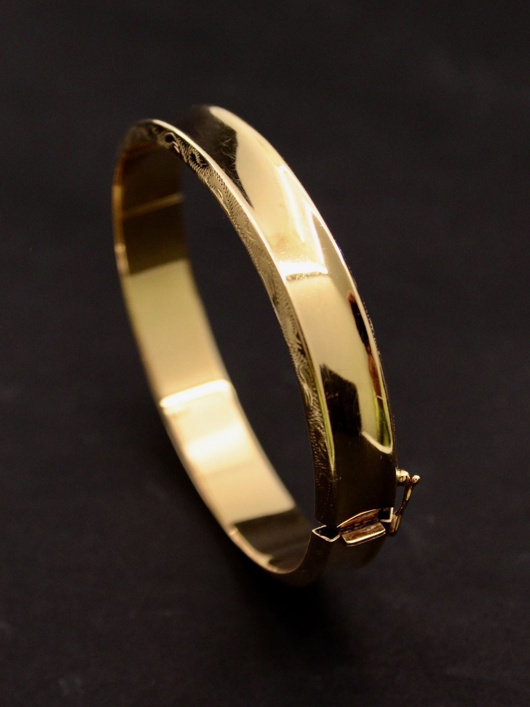 14 carat gold bangle inside 6.2 x 5.5 cm. b. 1.1 cm. weight 21 grams from goldsmith Fl. Lund Copenhagen subject no. 557382