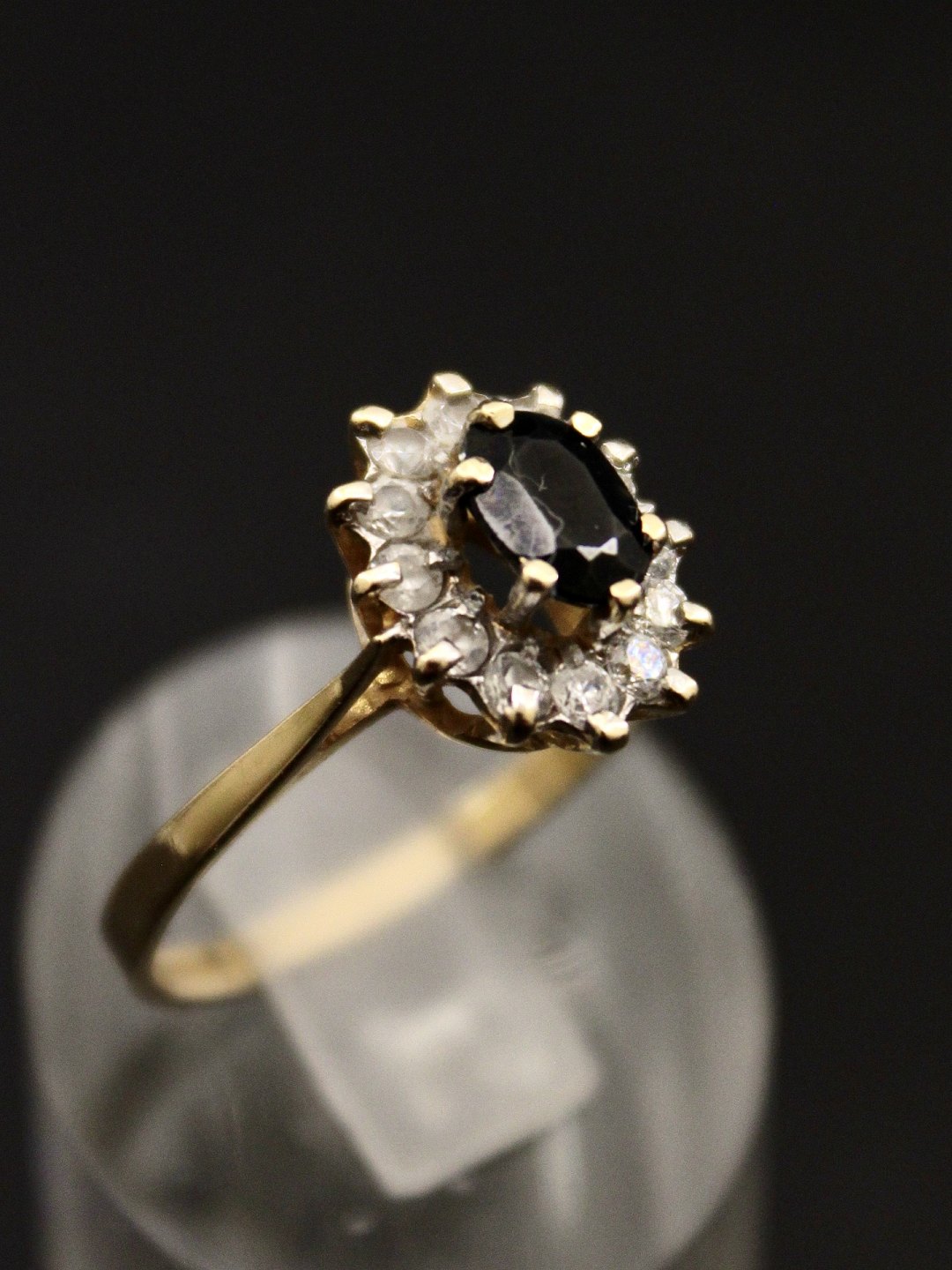 14 carat gold ring size 58 with amethyst surrounded by clear stones item no. 587140