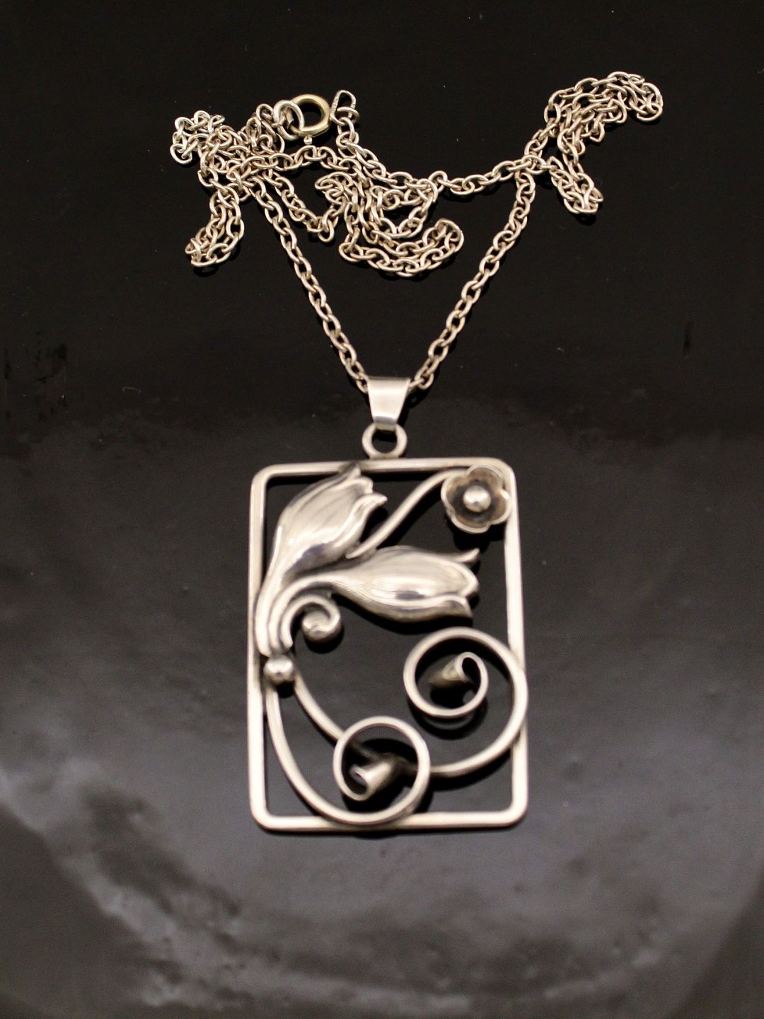 Art Deco 830 silver pendant 4.5 x 3.2 cm. and 830 silver chain 51 cm. From silversmith C A Christensen subject no. 590603
