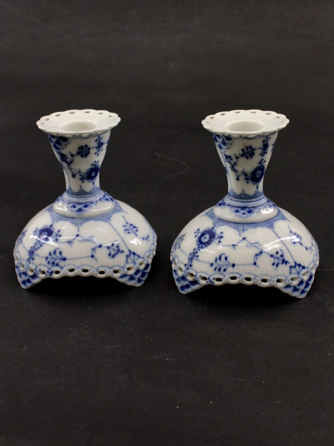 Royal Copenhagen a pair of full lace blue fluted candlesticks 1/1138 1st assortment item no. 602027