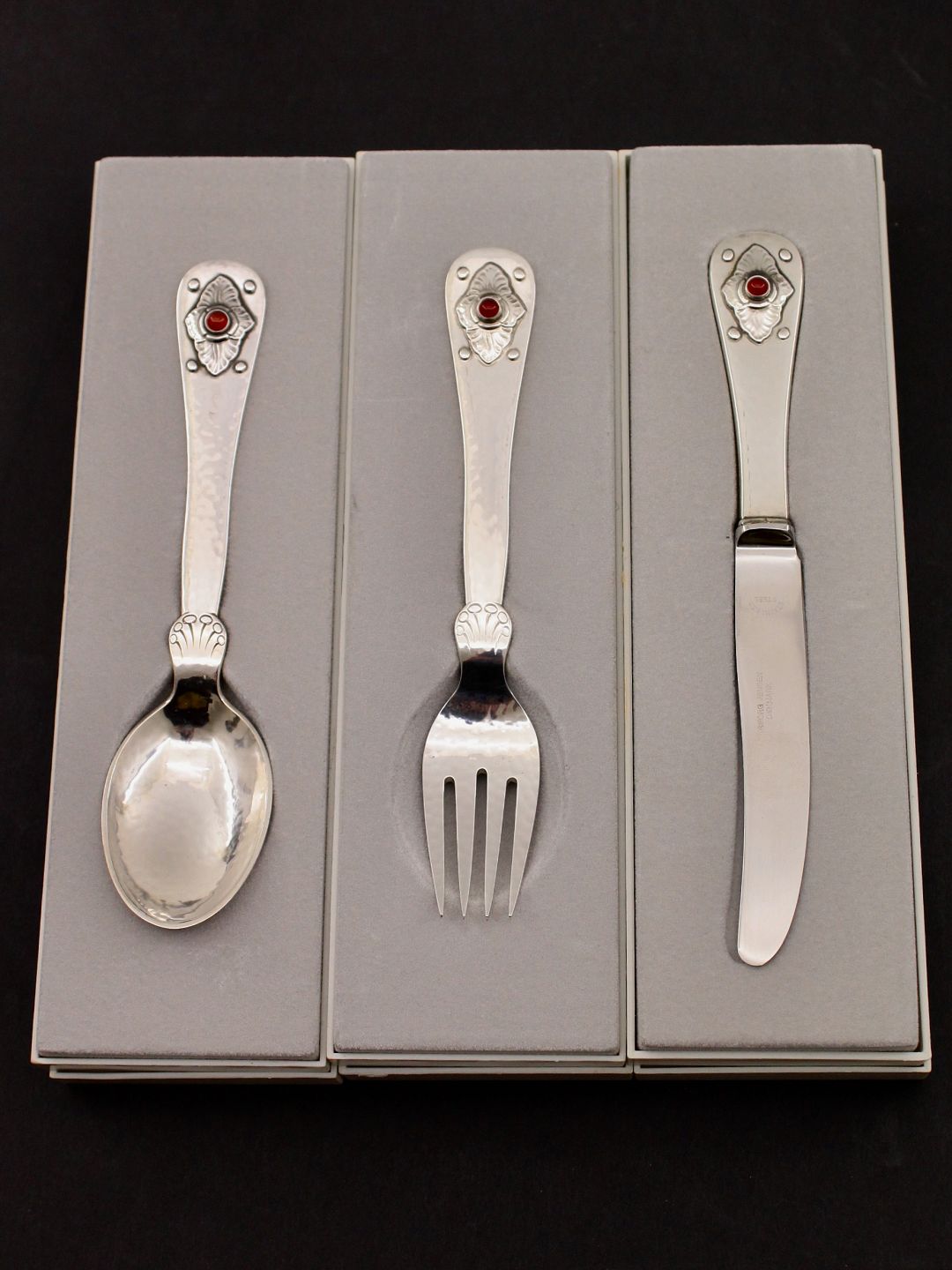 Georg Jensen anniversary children's cutlery sterling silver with carnelian, in great condition, in original boxes, item no. 607705
