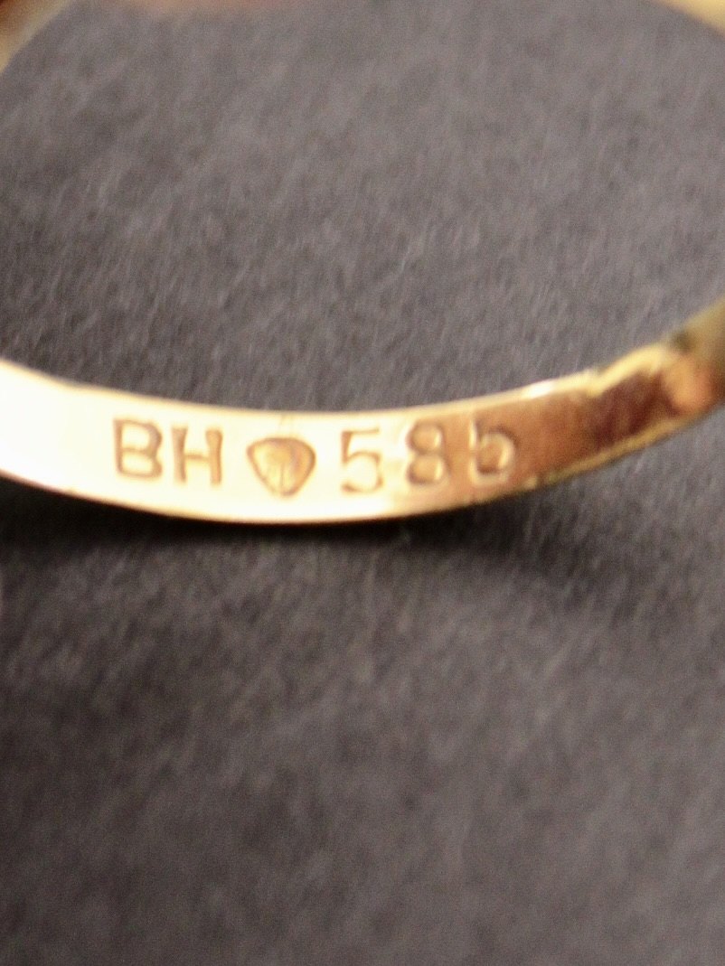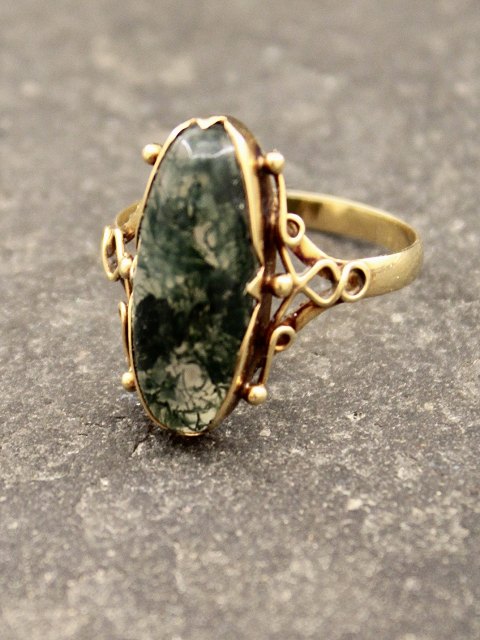 14 karat guldring størrelse 61 med mosagat stemplet 585 BH for hofjuveler B Hertz emne nr. 615528