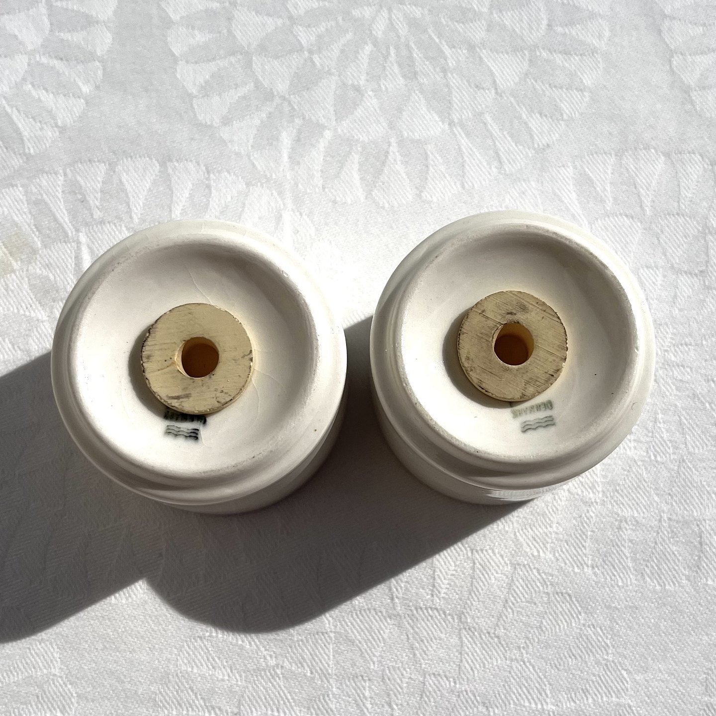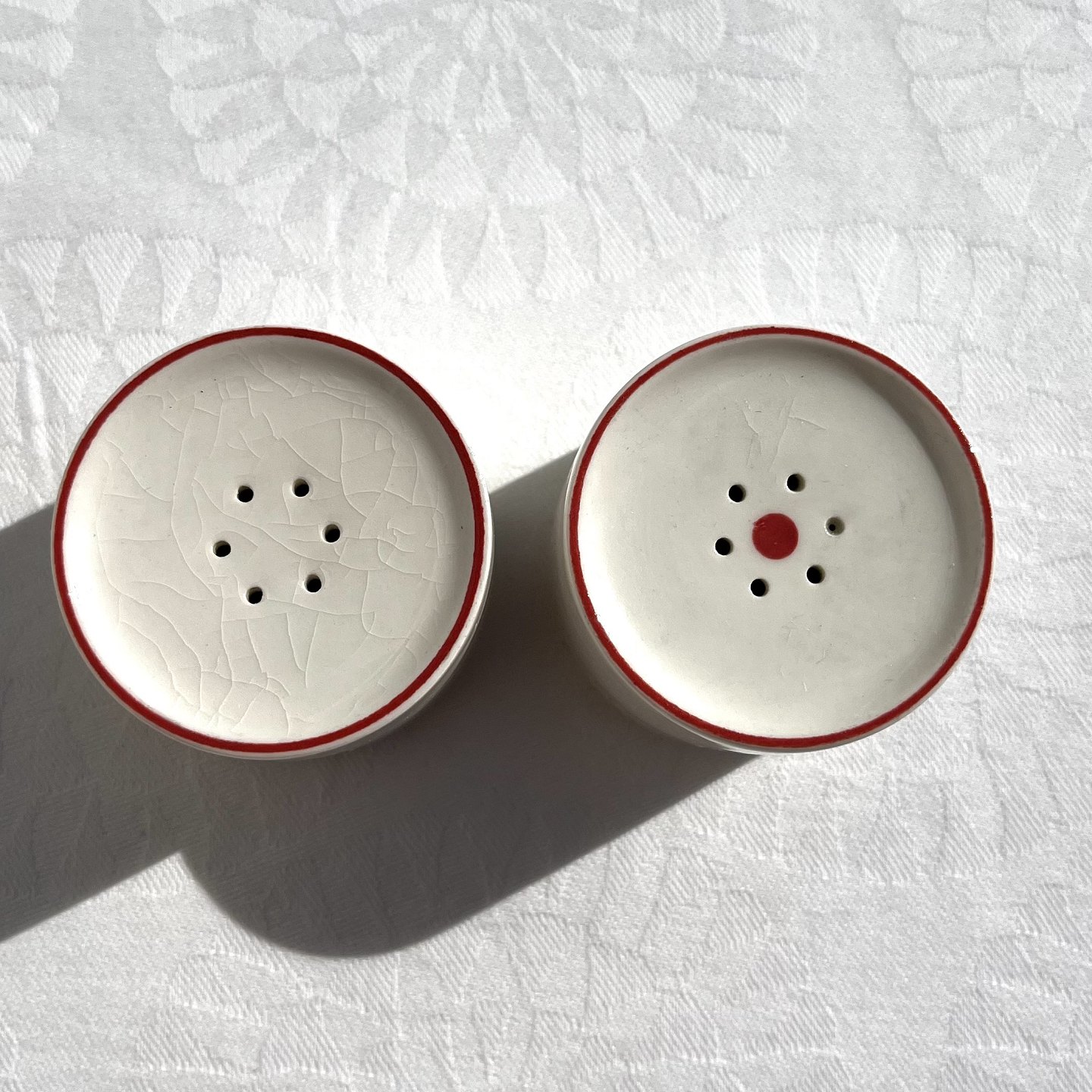Royal Copenhagen, Red top, Red border, salt & pepper set, 4cm high, 4.5cm in diameter *With some cracks*
