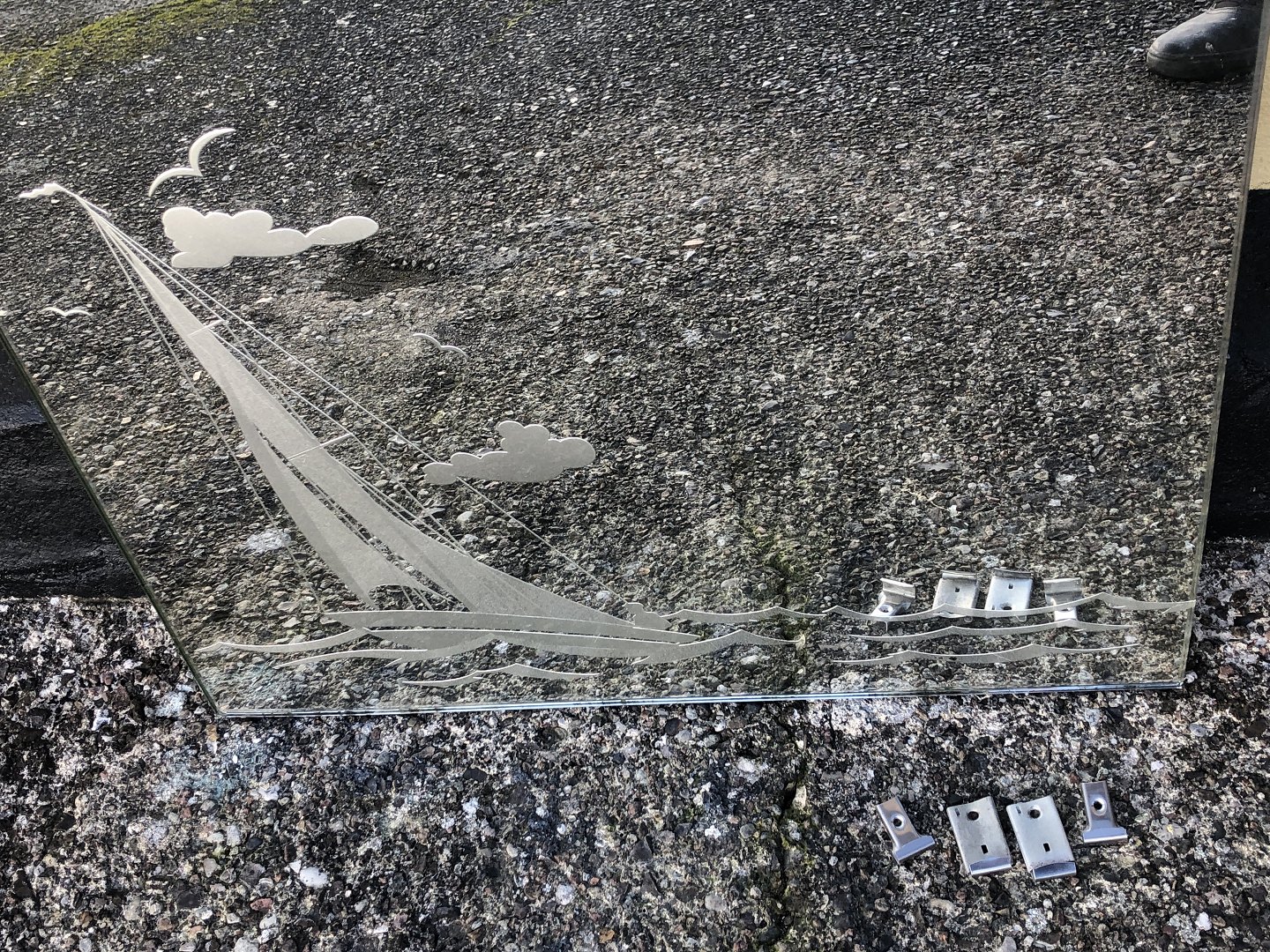 Mirror with incised sailing ship and 4 wall brackets. Nice used condition. Dimensions: 104x53 cm