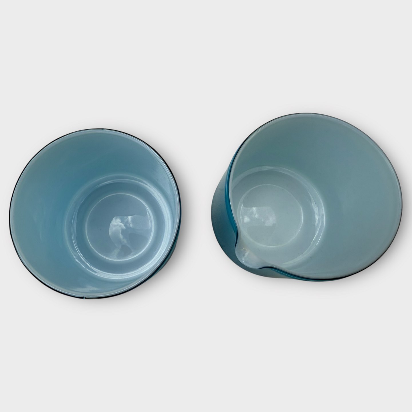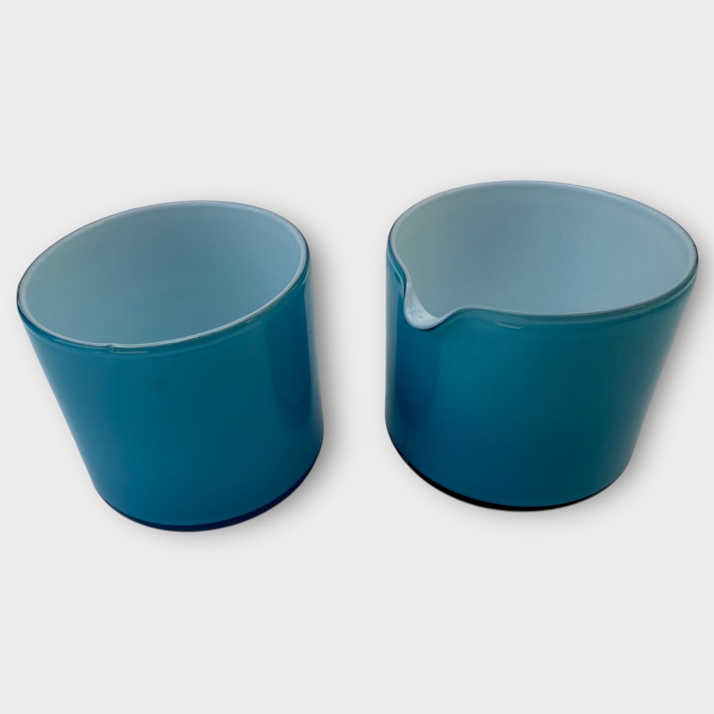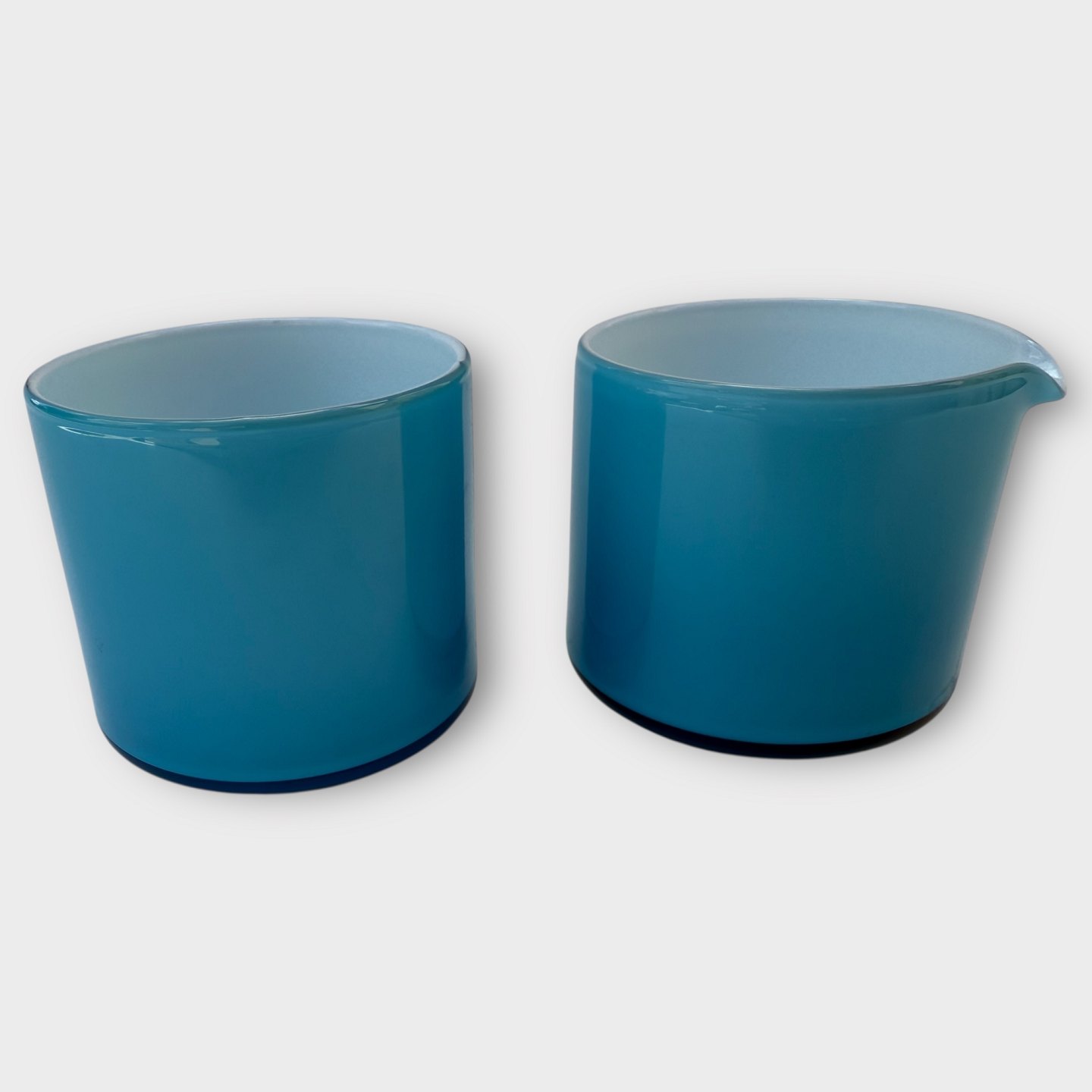 Holmegaard, palet, blue sugar and cream set, height 6.5cm, diameter 6.5cm, The sugar bowl has a small unevenness on the edge - not a chip (see photo) otherwise in good condition.
