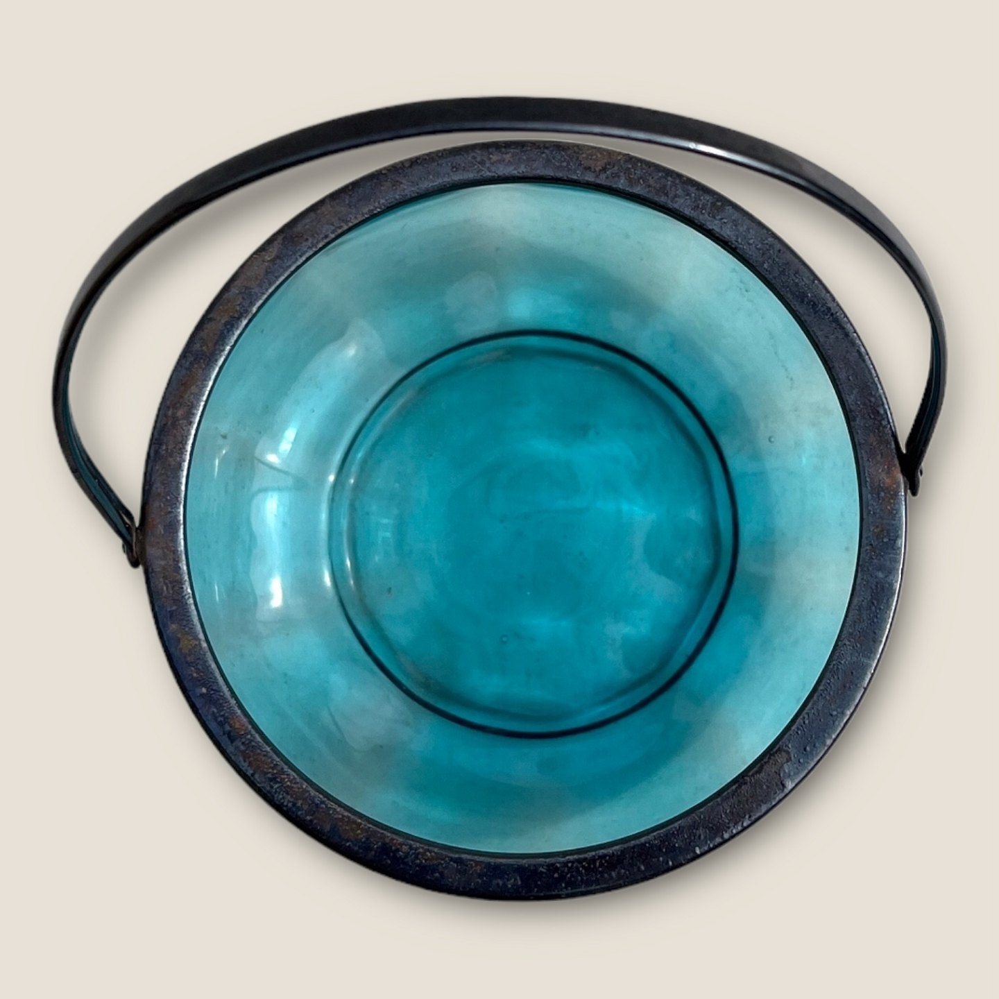 Bonbonschale, blaues Glas mit Metallfassung, 11cm Durchmesser, 5,7cm hoch *Guter Zustand*