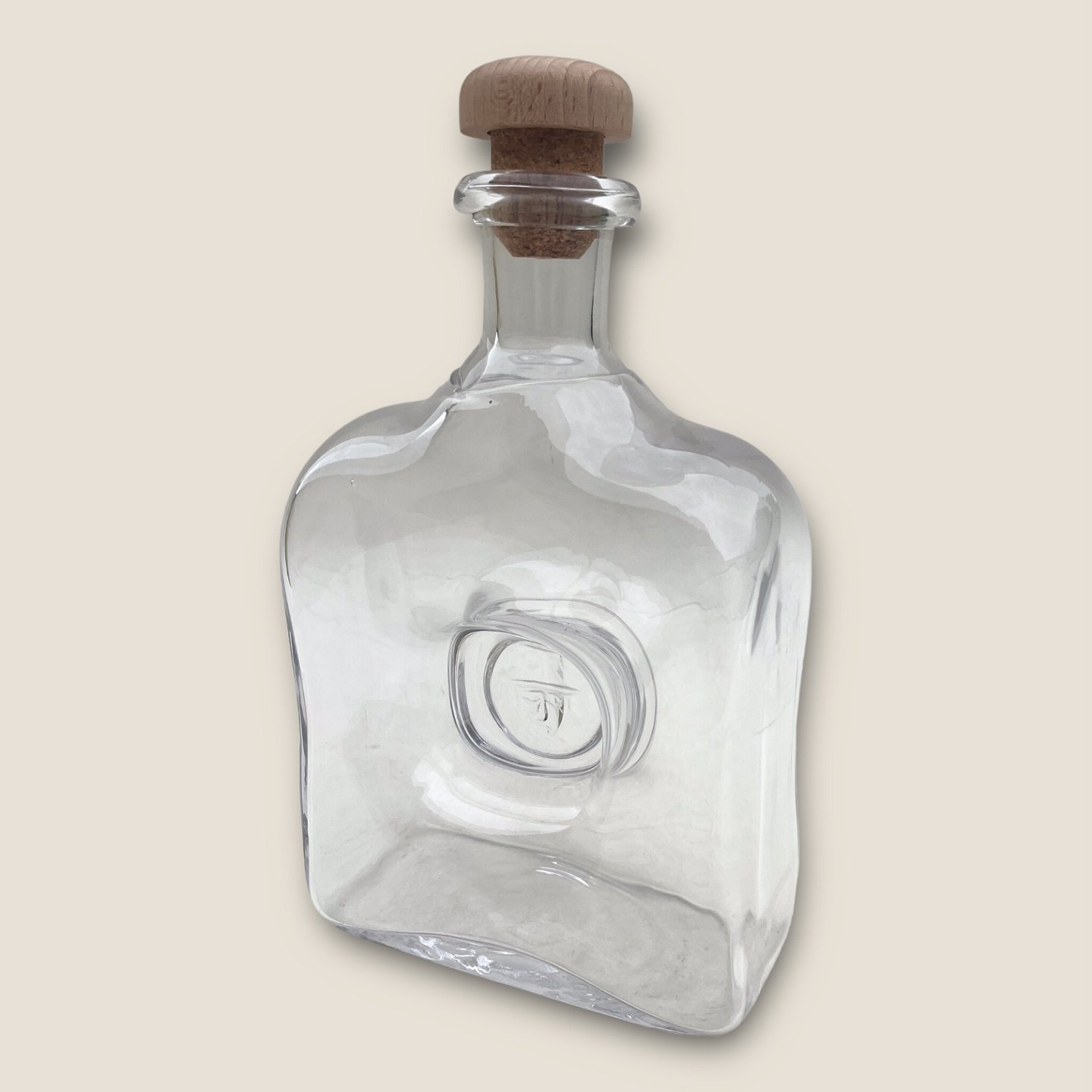 Glasflasche mit Holzverschluss, mit Gesicht und Hut, 13 cm breit, 22,5 cm hoch *Perfekter Zustand*