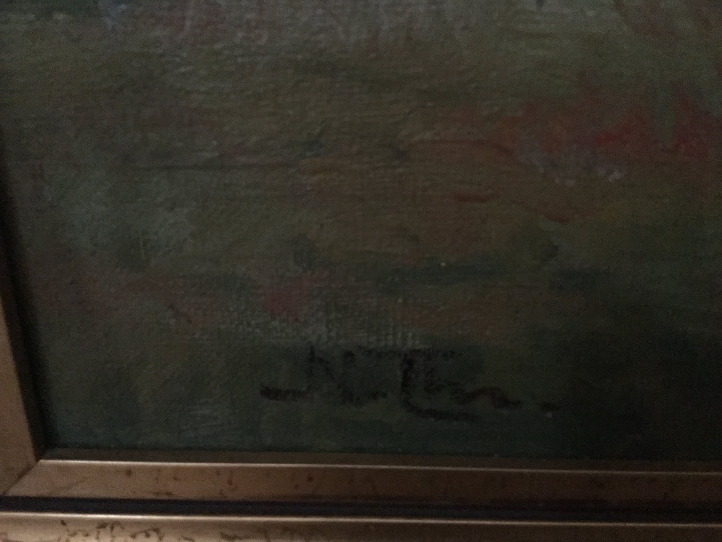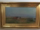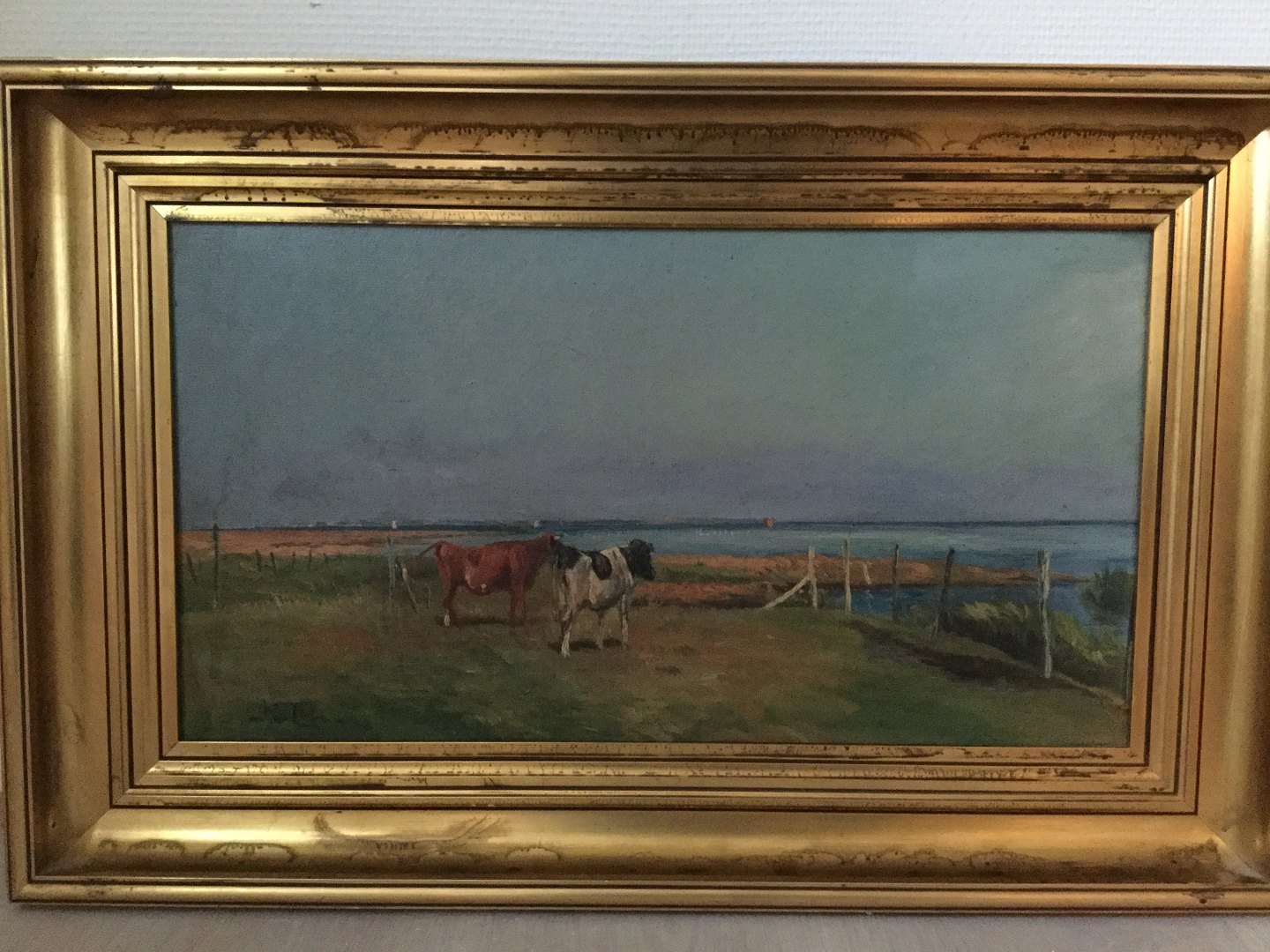 Niels Christiansen: to køer på strandeng, sandsynligvis Saltholm eller Amager. Signeret N. Chr. Mål 43,5x68,5 cm, med ramme 53x29 cm