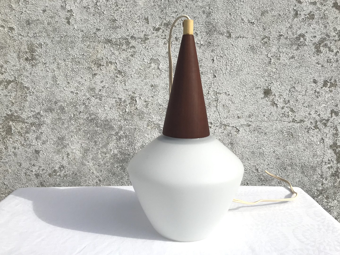 Glaspendel, mat opalglas med teak fatning, 32cm høj