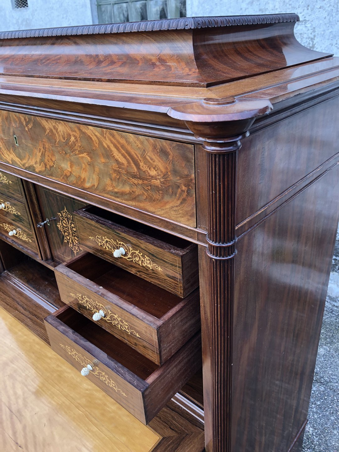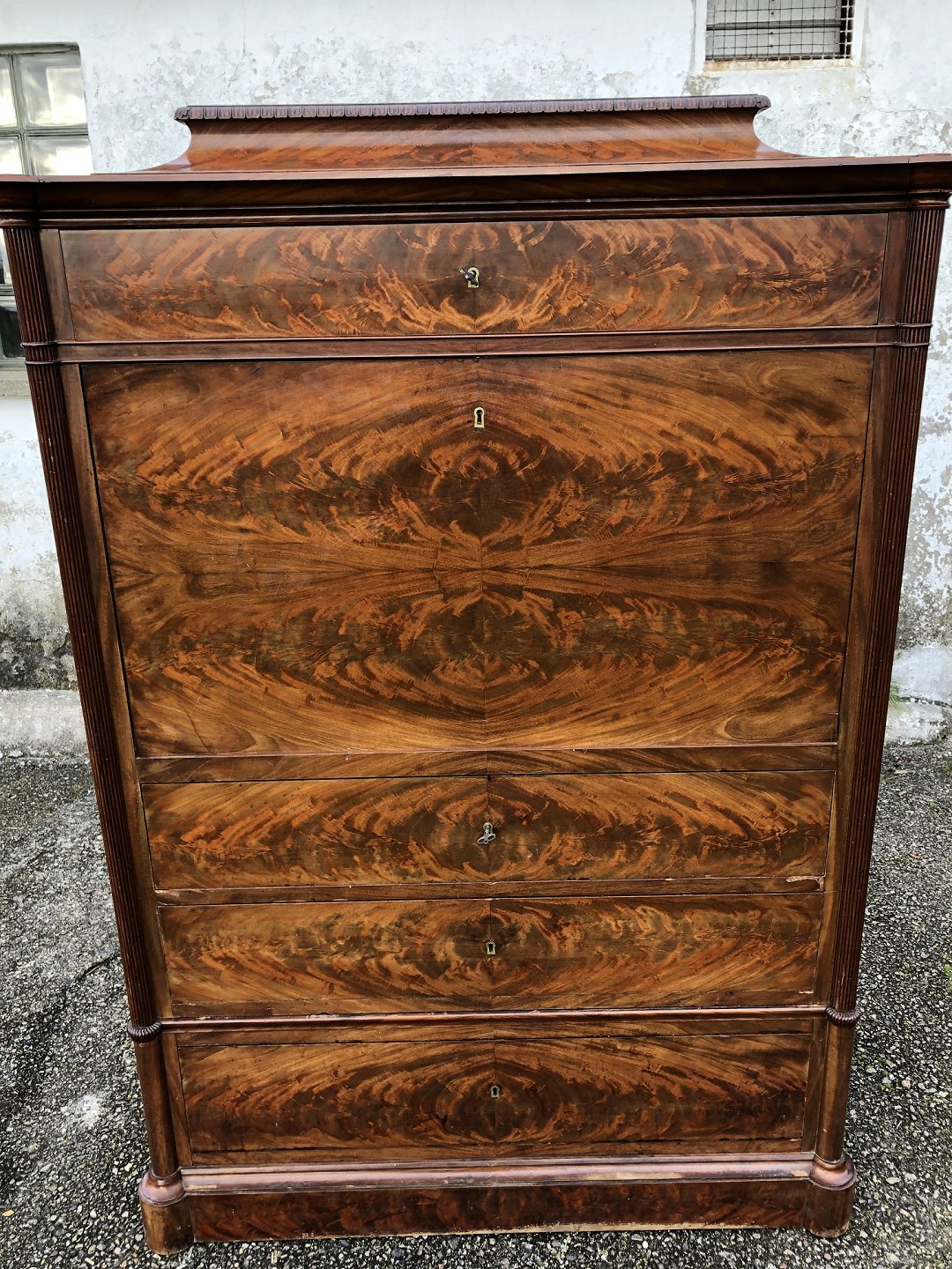 Sekretær i Mahognifiner med fine detaljer, enkelte små afslag. HxBxD 154x108x55 cm