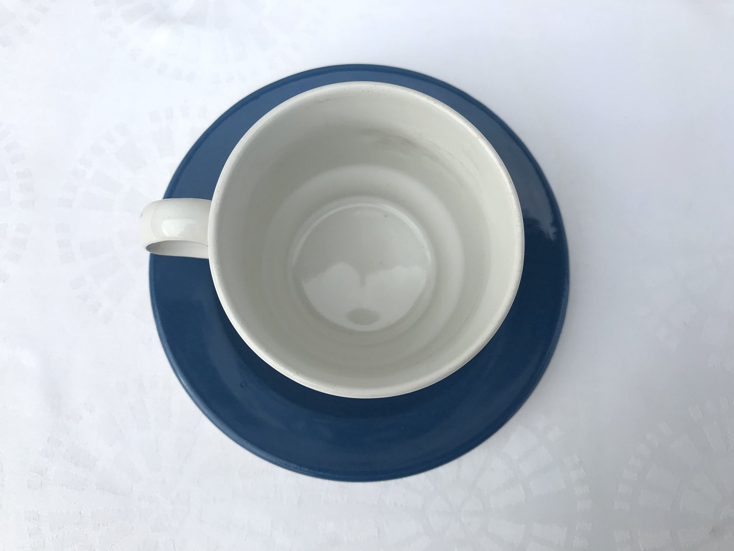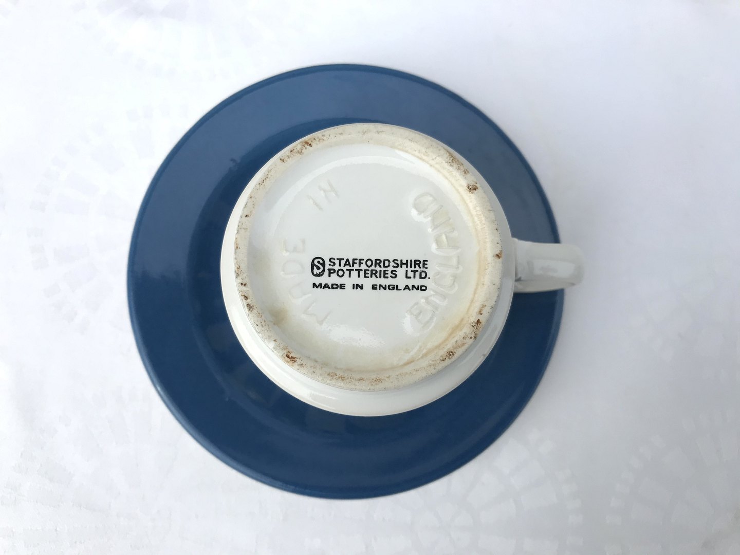 Staffordshire, Krus med underkop, blå retro blomster, 7,5cm høj, 7,5cm i diameter *Pæn brugt stand*
