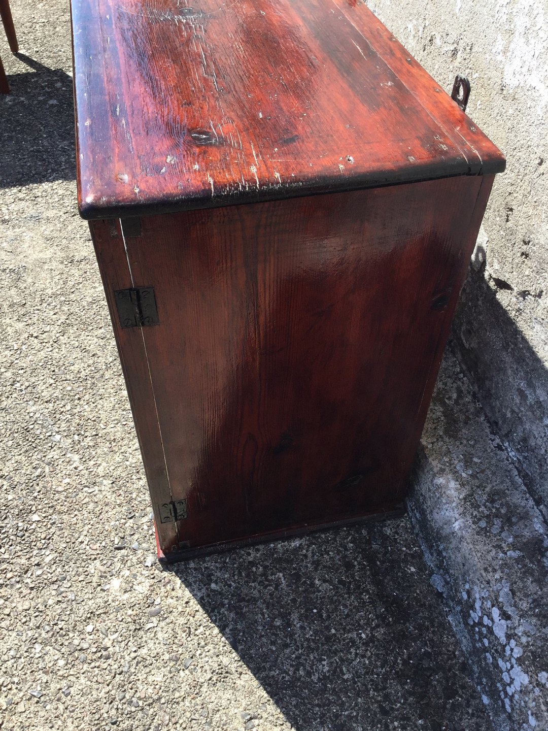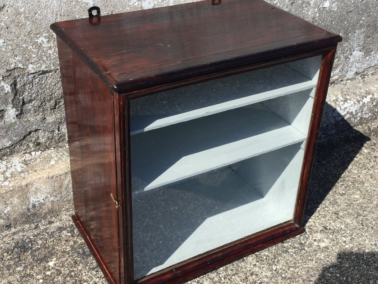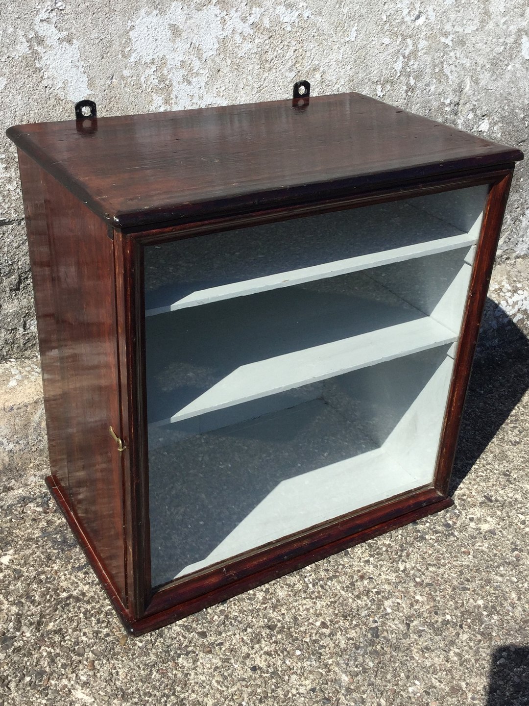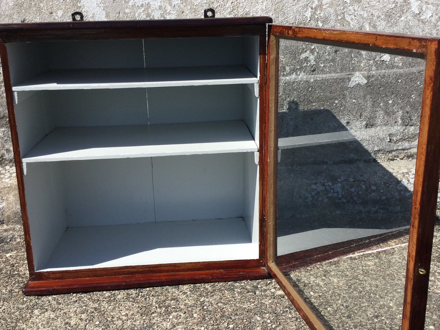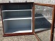 Mørkt lakeret træskab med glaslåge, indvendigt med grå bemaling. Pæn stand. Mål: HxBxD 60x58x37 cm