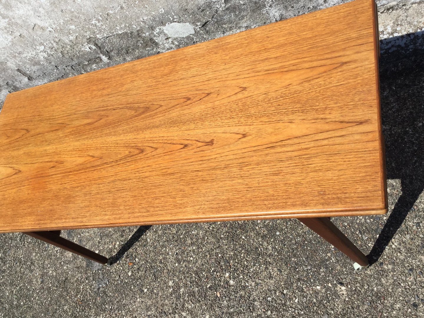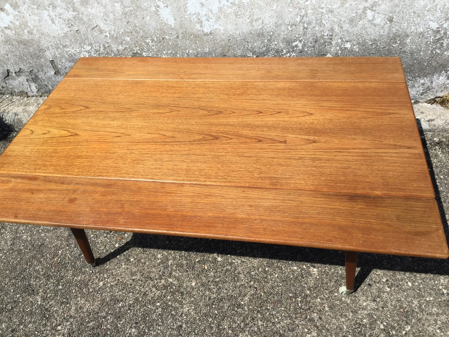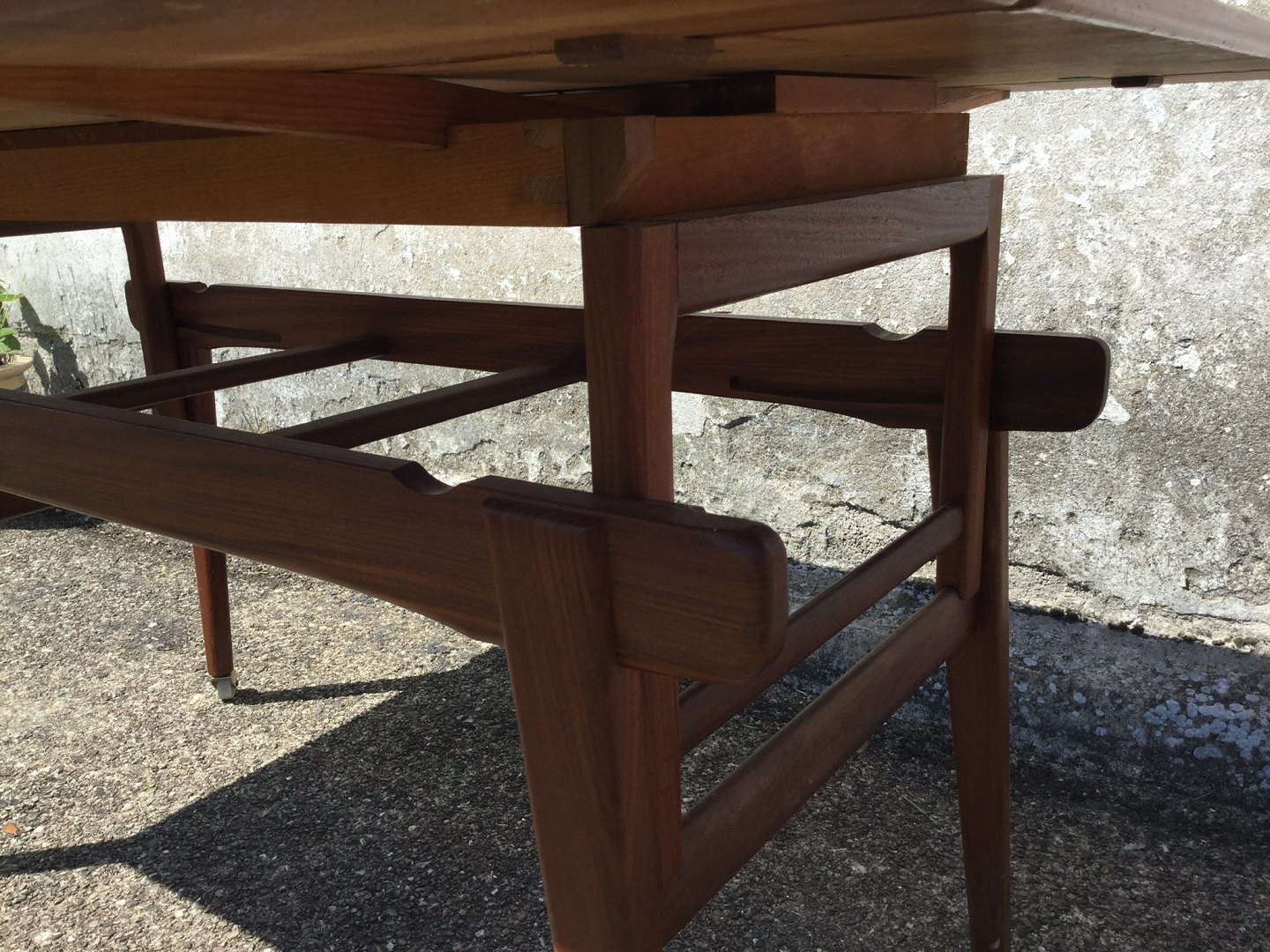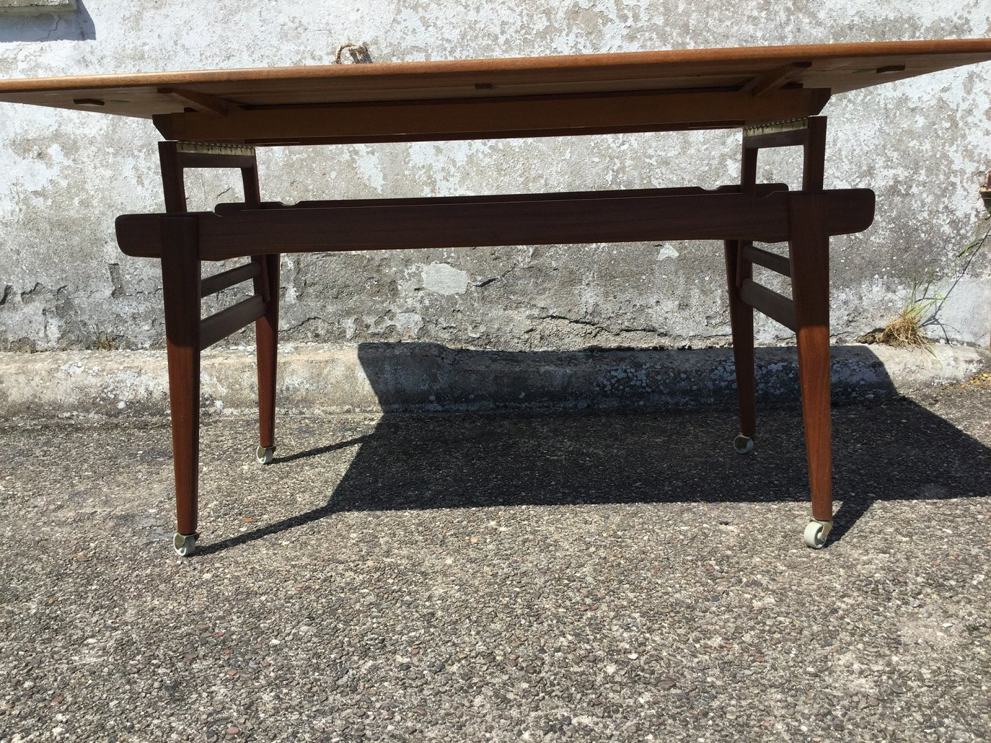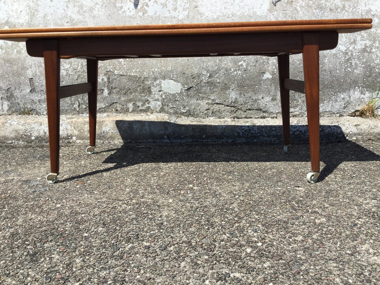 Sofabord / Spisebord med hæve/sænke funktion og udtræk i siderne. Teakfiner, Danish modern fra 1960'erne. Højde spisebord 75 cm, højde sofabord 60 cm. Længde 135 cm, Bredde 55 cm (udslået 91cm). Pæn brugt stand.