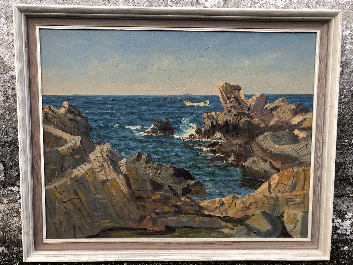 C. Corell, Kystlandskab Bornholm, Oliemaleri på lærred. Mål med ramme 91,5 x 83 cm. Enkelte brugsspor på rammen ellers pæn stand.