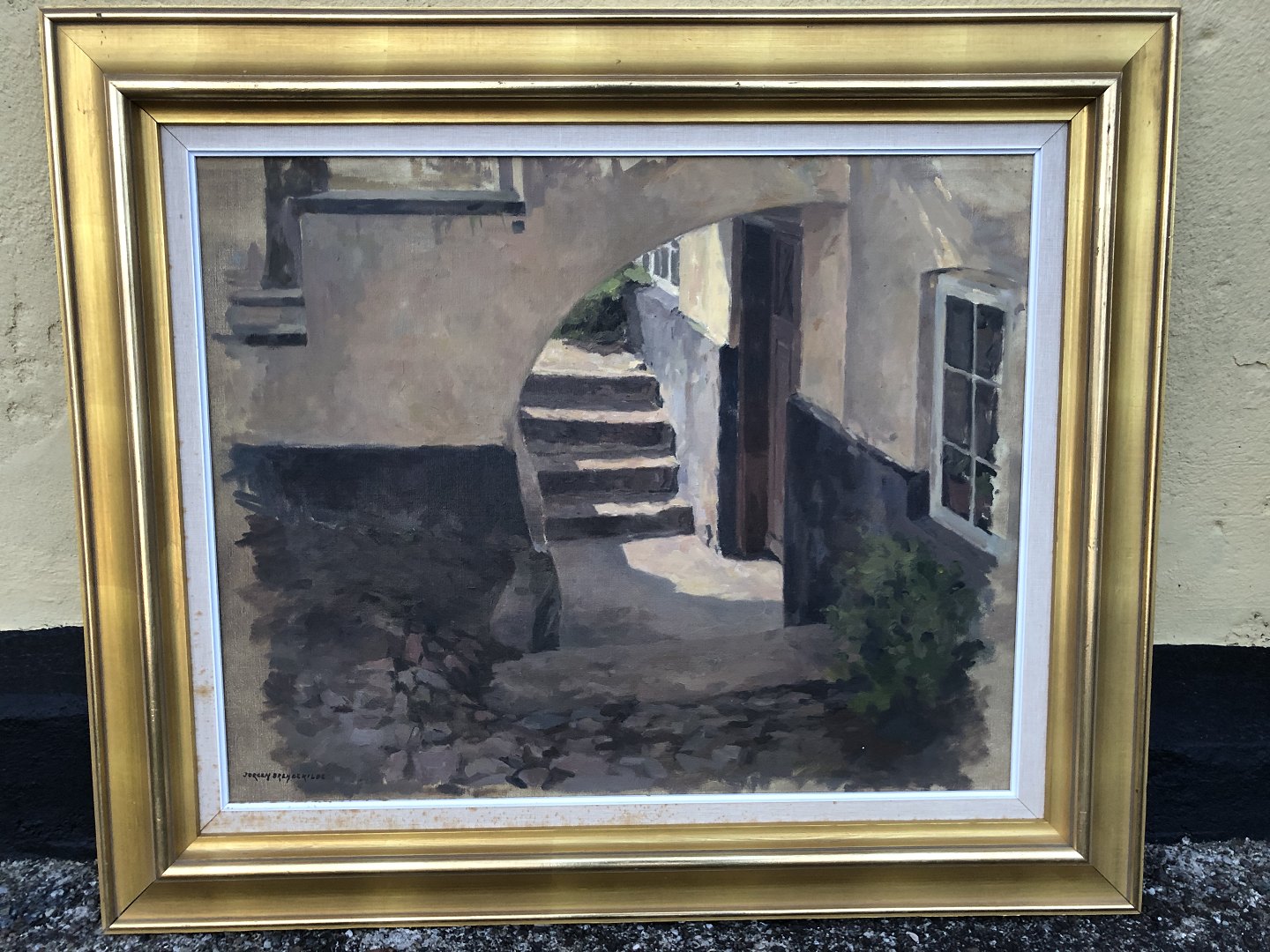 Jørgen Brendekilde (1920-1993) olimaleri på lærred, sollys ved trappe, Mål med ramme: 73x86 cm, lidt misfarvning på rammen ellers pæn stand.