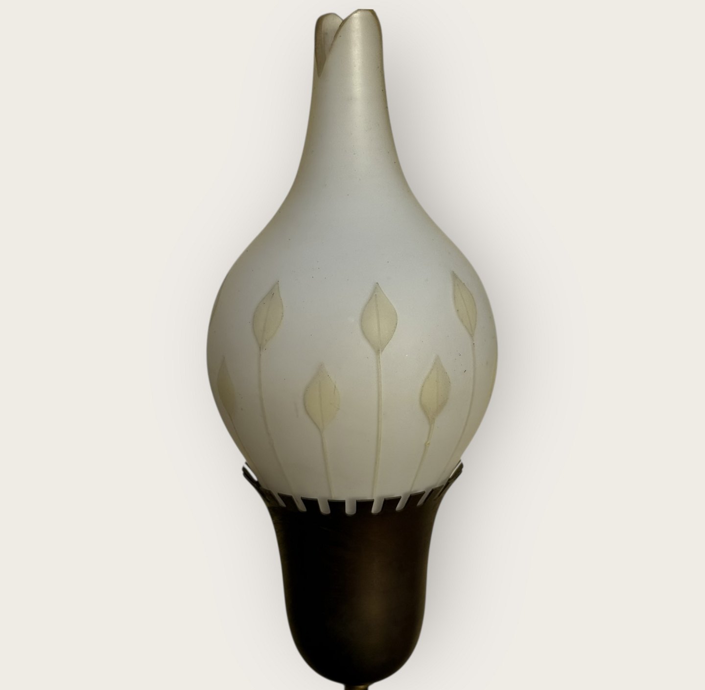 Lysekrone i messing med glasskærme, 5 store skærme i tulipan form, Sandsynligvis fremstillet hos Fog og Mørup, hver skærm er ca. 20cm høj og 10cm i diameter, selve lampen er 42cm i diameter og 67cm høj *Flot stand*