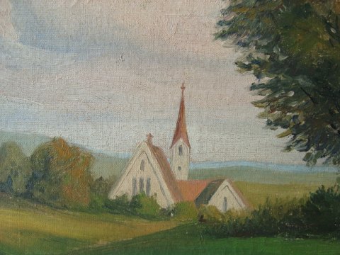 Svend Vilhelm Birkefeldt (1890-1966): Høstlandskab med tysk landsby med kirke i baggrunden 1921. Olie på lærred. Sign.: S. Birkefeldt - 21. 40x53 (51x65)