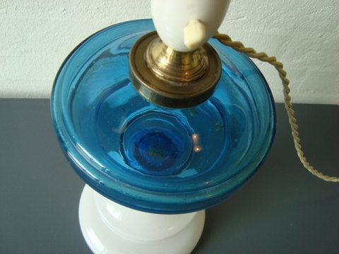 Fod af hvid opaline og petroleumsholder af transperent turkis glas.