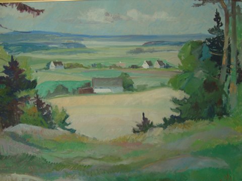 Nis Stougaard (1906-87): Landskab med gårde ved Silkeborg. Olie på lærred. Bagpå blindramme - "Parti fra Silkeborg" Sign.: Nis Stougaard 66x96 (80x110)