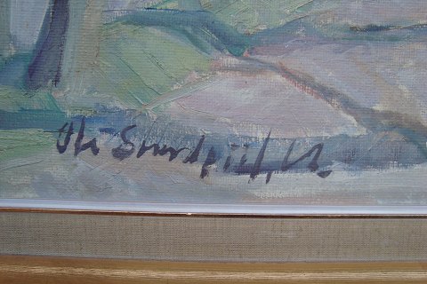 Ole Sværdpiil (1914-80): Landskan med huse og nøgne træer 1962. Olie på lærred. Sign.: Ole Sværdpiil - 62. 49x66 (57x74) Ole Sverpiil