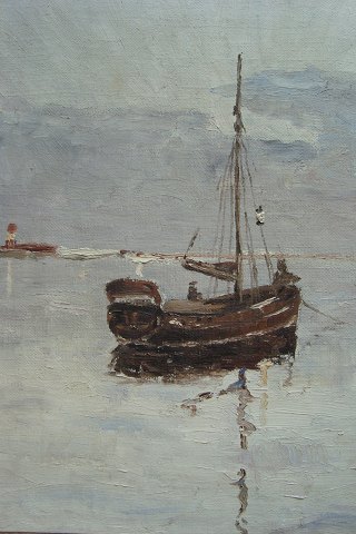 Ubekendt kunstner (20 årh): Fiskekutter ved havblik 1949. Olie på lærred. Utydelig sign.: Jørgen S.....??? - 49.(Én af mig ubekendt signatur). 50x62 (57x69) Et virkeligt dejligt og spændende maleri.