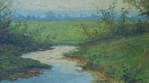 Aage Prior (1866-1936): Landskab med å. Olie på lærred. Sign.: Axel Larsen (pseudonym) Bagpå blindramme tekst - Vundet på Bazar i Frelsens Hær 1937. 29x40 (38x49)