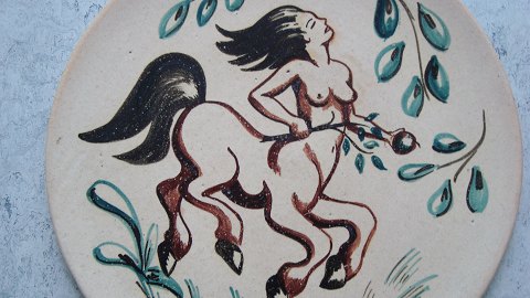 Ubekendt kunstner (20 årh): Stort bordfad. Keramik med ecru glasur og brun og grøn dekoration. Dekoration - Kvindelig Kentaur i form af Eva med æblet i Edens Have. Diameter - 41 cm.