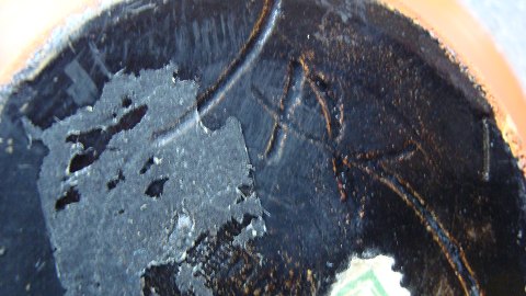 Keramik med orange uran glasur og sort bund.