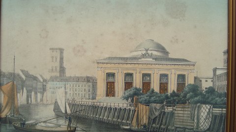 Prospekt af Thorvaldsens Museum (opført 1848), C.F. Hansens Christiansborg (før branden) samt Sankt Nikolaj Kirke (før spiret i 1909) set fra Stormbroen.