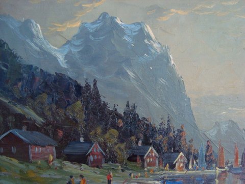 Gustav P. Rimmer (1904-88): Fjordparti med huse og bjerge - antagelig Norge. Olie på lærred. Sign.: G.P. Rimmer. 40x50 (48x58)