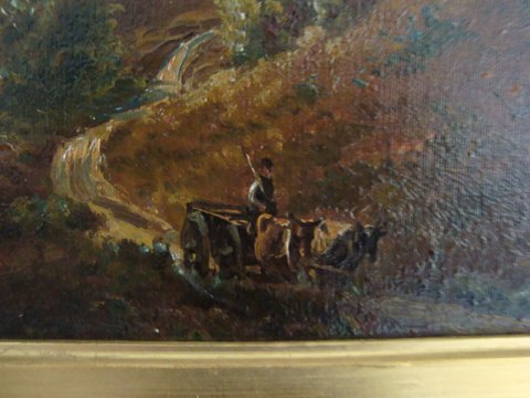 Oluf Simony Jensen (1864-1923): Landskab ved Silkeborgsøerne med Himmelbjerget i baggrunden og en oksekærre i forgrunden. Olie på lærred. Sign.: Simony Jensen 37x58 (45x67) Smukt maleri af høj kvalitet.