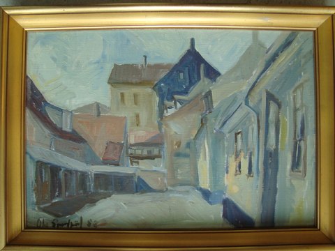 Ole Sværdpiil (1914-80): Byparti 1958 - antagelig Århus. Olie på lærred. Sign.: Ole Sværdpiil - 58. 34x48 (38x53)
