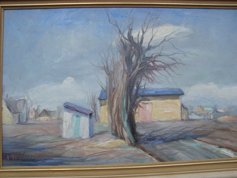 Landsbygade med stynet træ og huse samt personer ved drivhus.