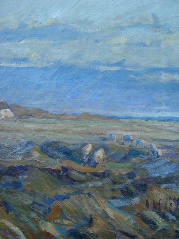 Jakob Hübschmann (1894-1974): Marsklandskan med marskgård og græssende får samt by i baggrunden med kirke. Olie på lærred - nyrenset. Sign.: J. Hübschm. Indrammet i Varde. 46x74 (54x81)