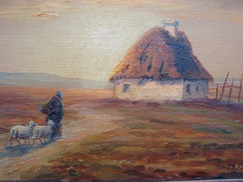 Sergius Frost (1900-94): Fårehyrde på vej mod hus på heden 1931. Olie på lærred. Sign.: S. Frost 1931 Bagpå - Sergius Frost samt monogramsignatur 19 SF 31. 25x33 (35x42)