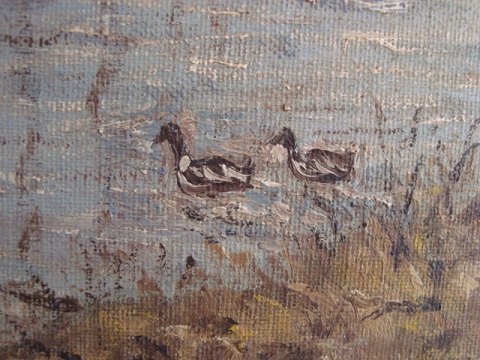 A. Hillertz (20 årh): Søparti med ænder og solen der bryder igennem. Olie på lærred. Sign.: A. Hillertz 29x36 (34x40)