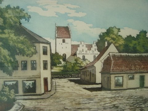 Peder Møller (1890-1961): Parti fra Nørresundby med kirken i baggrunden. Farveradering på papir. Betegnet - Nørre Sundby Sign.: Peder Møller 51x59 (58x67)