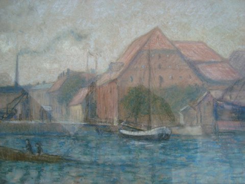 Ubekendt kunstner (20 årh): Havneparti fra København? pastel på papir. Usigneret. Indrammet i meget smuk, gammel og tung guldramme. 35x46 (49x60)