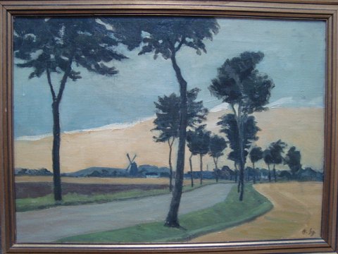 Landevej med træer og landsby med mølle i baggrunden.