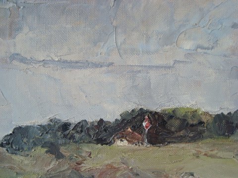 Carl Johan Tandrup (1921-92): Parti fra Rebild Bakker med Blokhuset og Top Karens Hus. Olie på lærred. Sign.: Carl Johan Tandrup 77x98 (93x114)