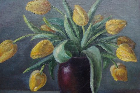 Ubekendt kunstner (20 årh): Gule tulipaner i vase. Olie på lærred. Sign.: OO 31x37 (40x45)