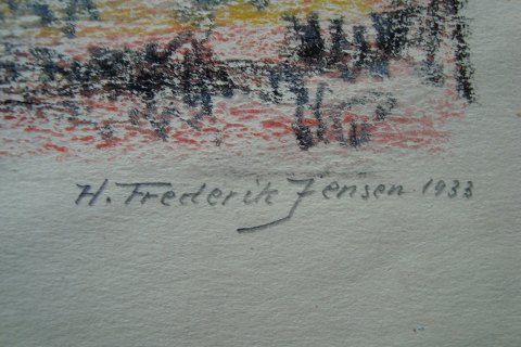 H. Frederik Jensen (20 årh): Parti fra Faxe Ladeplads 1933. Oliekridt/pastel på papir. Sign.: H. Frederik Jensen 1933. Betegnet med bly - Parti fra Faxe-Ladepl. Uden ramme. 25x33 811