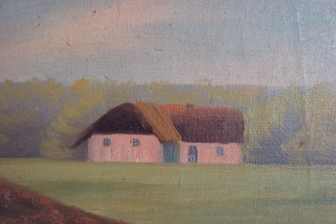Ubekendt kunstner (20 årh): Bondehus ved skov. Olie på lærred. Sign.: Hartmann 30x45 (40x55)