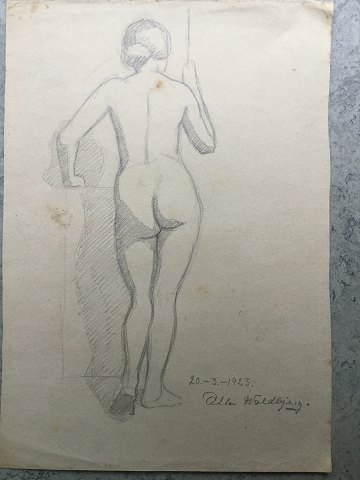 Stående, nøgen og rygvendt kvinde ved mur 1923.
