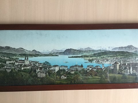 Koloreret foto/tryk. Starten fa den 20 århundrede. Indrammet i mahogni ramme hos H. Bentzon i Ribe. Vue ud over Luzern, Schweiz. Betegnet - 4601 P.Z. Luzern. Indrammet måler billedet - 22x53.