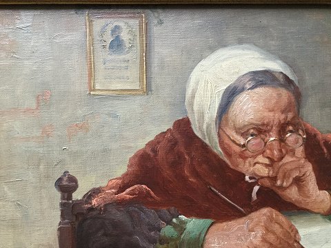 Oluf Simony Jensen (1864-1923): Gammel kone skriver brev i stuen.. Olie på lærred. Sign.: Simony Jensen 30x38 (39x47)